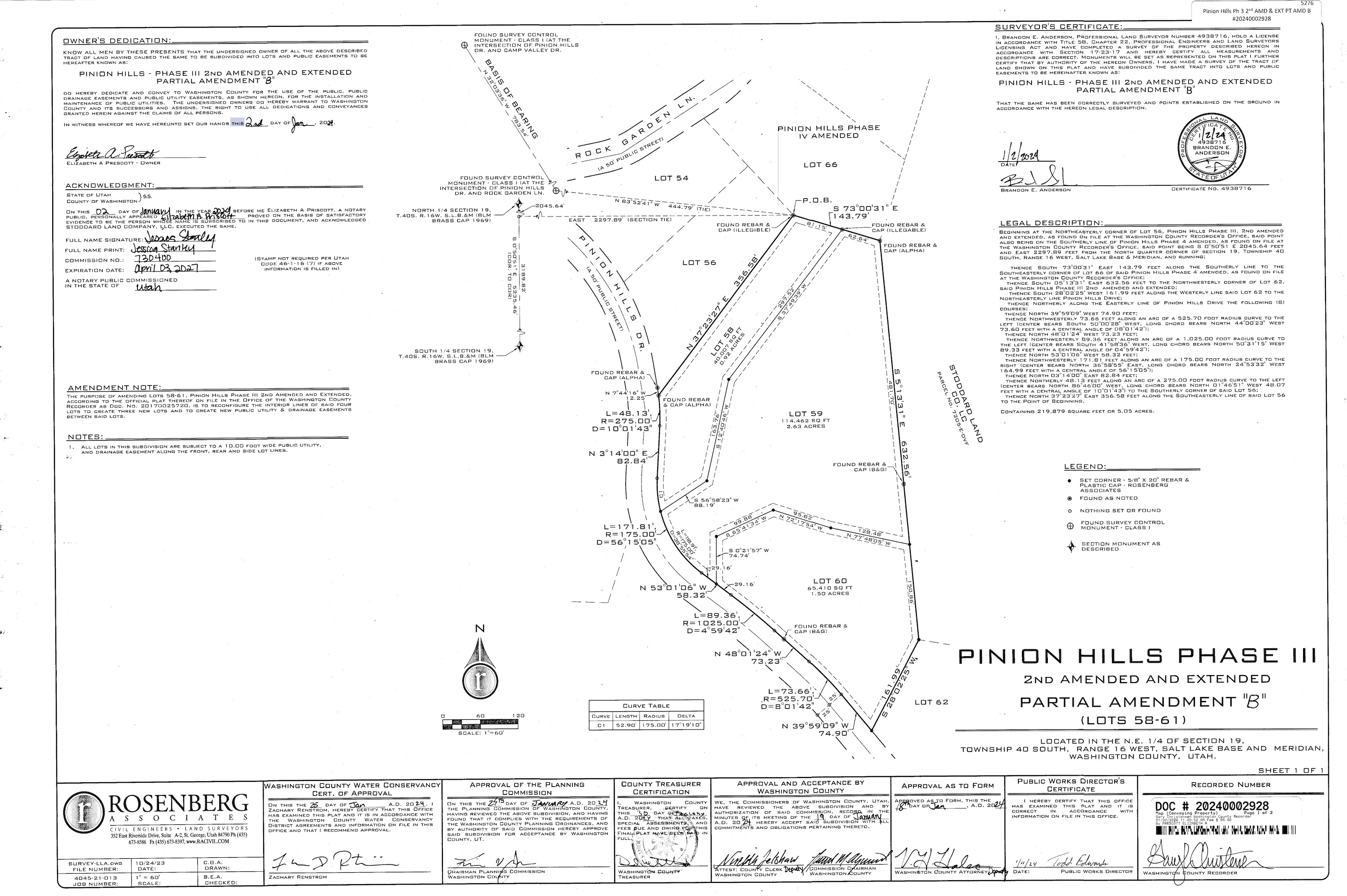 Below is the amended plat to my previous Lots 58, 59, 60, and 61. I folded Lot 61 into Lot 60 to create luxurious buffers for both 59 and 60. You can see Lot 59 where I'm currently building a main house and small casita about 50 feet north of the property line to Lot 60, further enhancing the buffer. Generally the setback is 10 feet in Pinion Hills, so the privacy of Lot 60 more resembles what you would achieve with a 2-acre lot. The amended plat was recorded on January 30, 2024. By combining what is currently Lot 61 with much of lot 60, the new Lot 60 is over 1.5 acres. This is the only lot of its size available at the top of Pinion Hills, including roughly 350 feet of frontage.